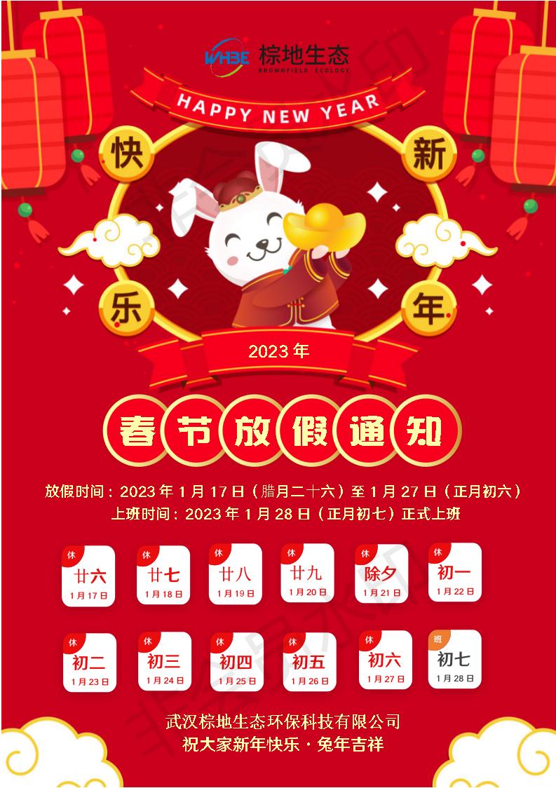 ? ? ? ? ?感謝您一直以來對我們工作的支持與理解,2023年新春將至,武漢棕地生態(tài)環(huán)保科技有限公司全體員工預祝大家新年快樂,兔年吉祥。